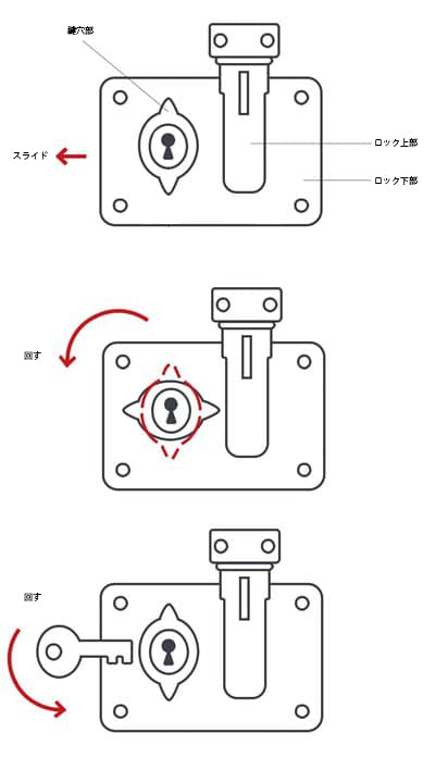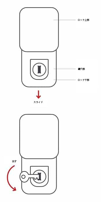 開ける際は鍵穴部分全体を下側にスライドさせてください。ロックする / ロック解除