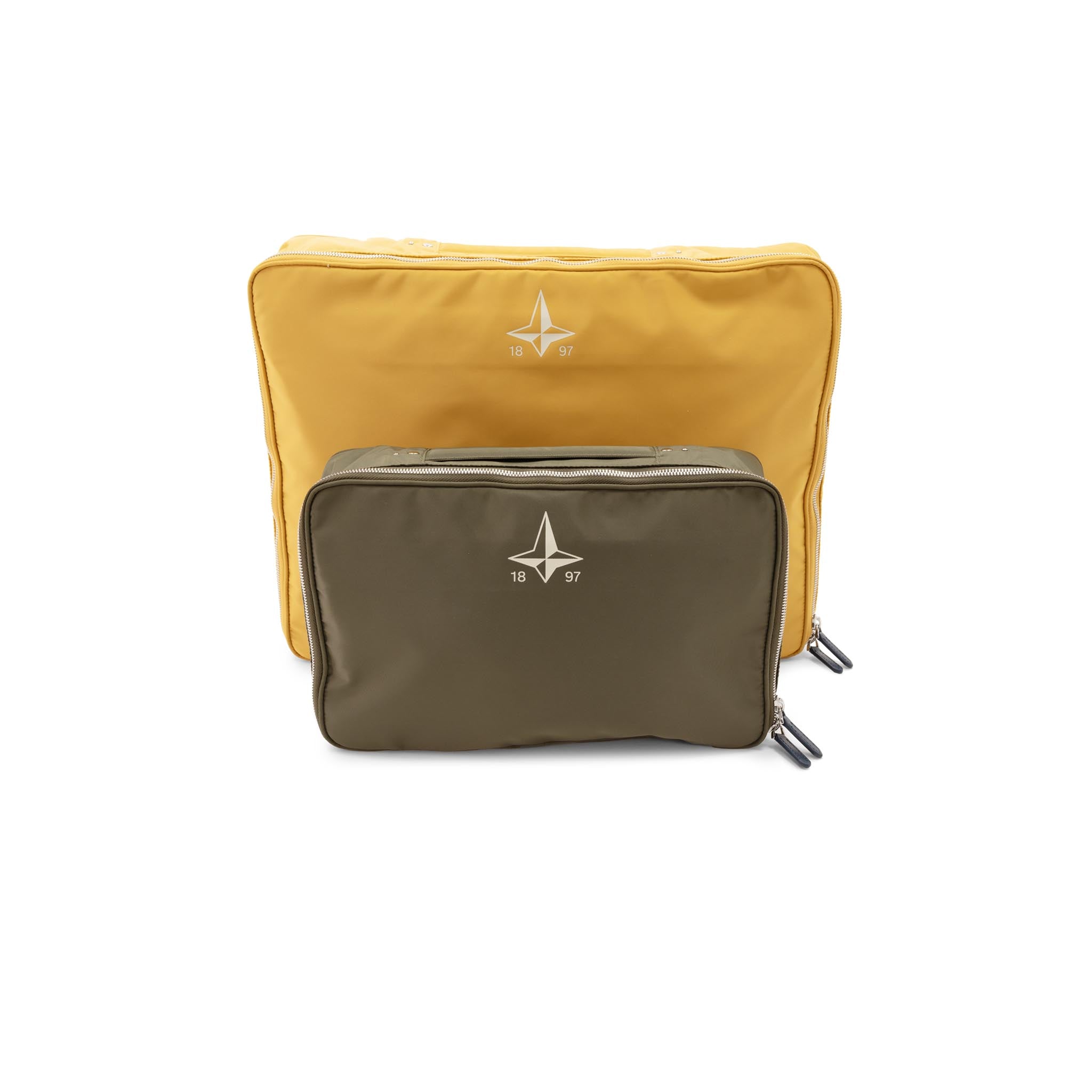 落ち着いたカーキグリーンのような印象を持つ、シックなオリーブカラー。控えめながらも旅の装いに洗練を添える色合いです。内側は深みのあるネイビー。フロントには、1897年創業を象徴するノース・スターロゴが配され、印象的なアクセントに。