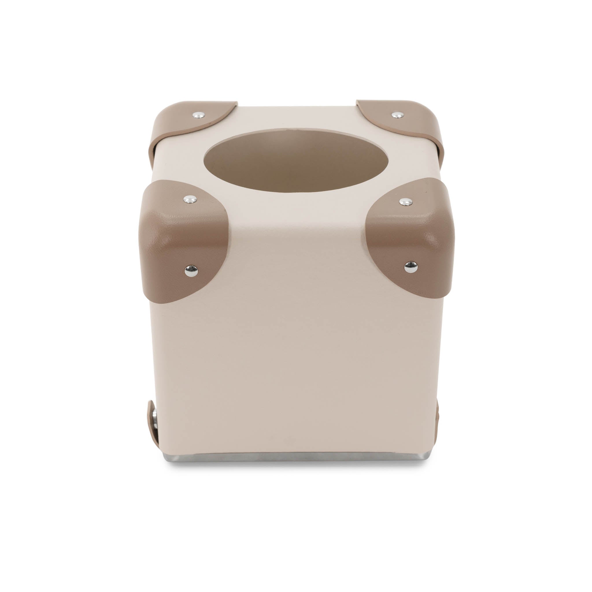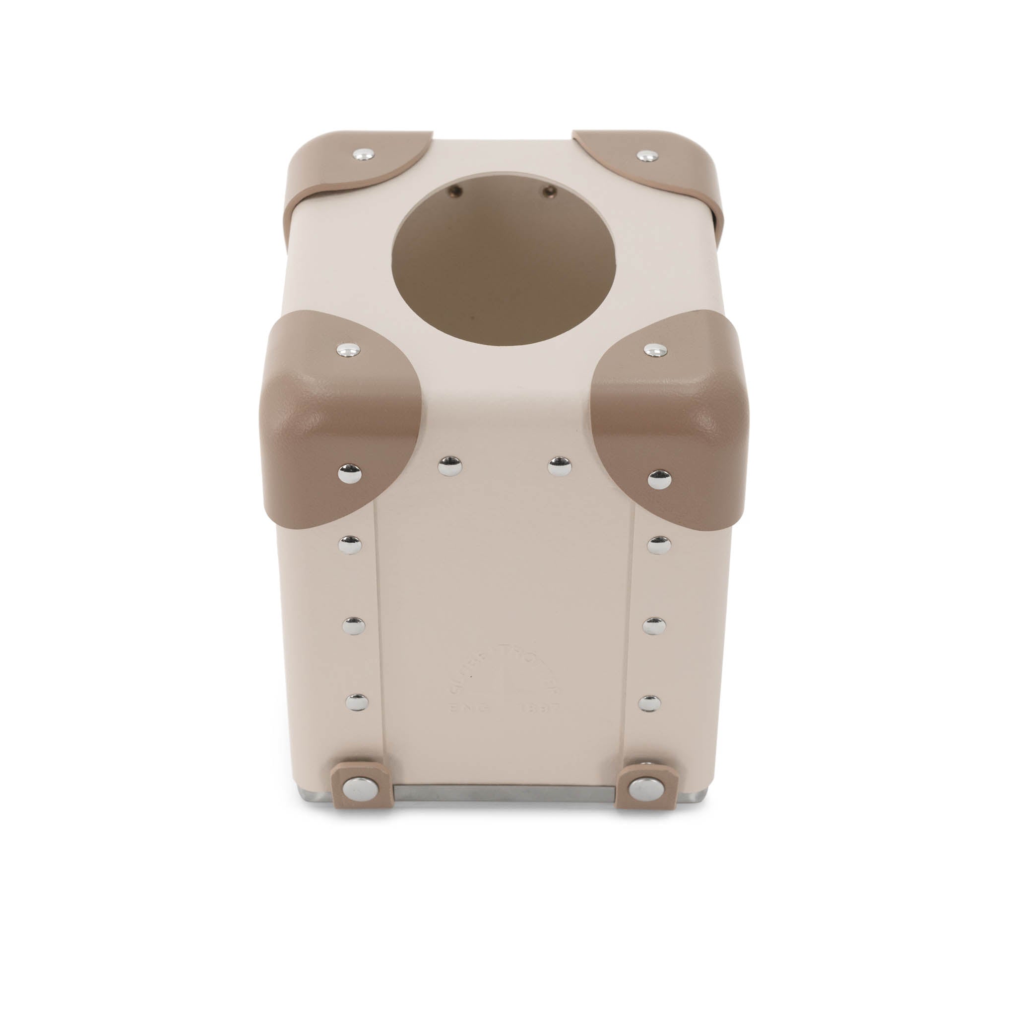 ボディにはチョークカラーのヴァルカナイズド・ファイバーボードを使用し、モスカラーのレザーコーナーを組み合わせています。スクエア型ティッシュボックス(英国規格)に合わせて設計されており、モダンにもクラシックにも調和するバランスの取れたプロポーションです。