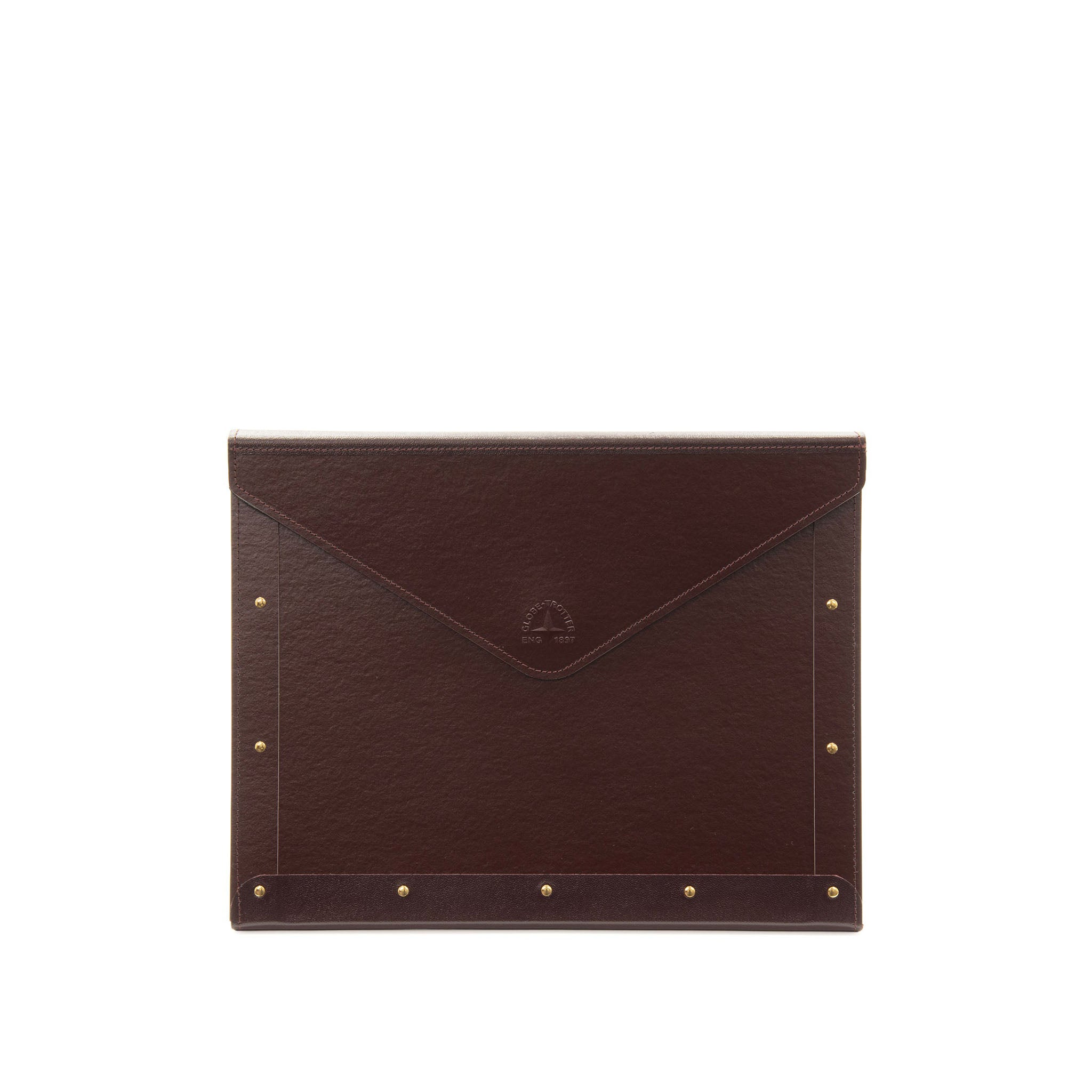 グローブ・トロッターのヘリテージデザインを、現代のビジネスシーンにふさわしく再構築したドキュメントスリーブ。英国ハートフォードシャーの工房にて職人の手で仕立てられ、ヴァルカン・ファイバーを本体素材に採用しています。